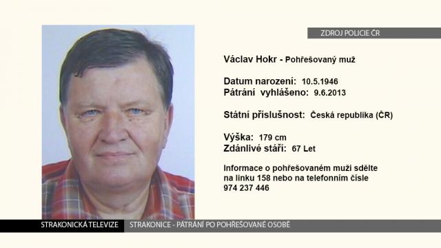 Policie ČR odvolala pátrání po pohřešovaném Viktoru Mikovi. Jeho tělo bylo nalezeno bez známek života v lesním porostu nedaleko Radomyšle. Policisté dále pátrají po 67letém muži ze Střelských Hoštic Václavu Hokrovi. Muž je nemocný, užívá léky, které nemá s sebou. Naposledy byl viděn v neděli 9. června v odpoledních hodinách, kdy odcházel směrem na Střelskohoštickou Lhotu. Na sobě měl tmavou bundu s kapucí a šedé kalhoty. Pod bundou by mohl mít bílé triko, šedý propínací svetr a na nohou pantofle. Jakékoli informace o pohřešovaném muži sdělte na linku 158 nebo na telefonním čísle 974 237 446.
