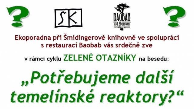 Jsou nové reaktory v Temelíně skutečně potřeba? Kolik za ně zaplatí český spotřebitel? Máme jiné možnosti, jak zajistit naše energetické potřeby? Na tyto a mnoho dalších otázek se pokusí odpovědět Edvard Sequens z českobudějovického sdružení Calla při první letošní besedě z cyklu Zelené otazníky, kterou připravuje Ekoporadna při Šmidingerově knihovně ve Strakonicích. Akce se koná ve středu 22. ledna od 18 hodin ve strakonické restauraci Baobab. (bob)
