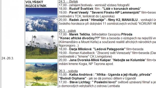 Kino ve Volyni bude hostit již šestý ročník cestovatelského minifestivalu Volyňský rozcestník. Od čtvrtka 24. do soboty 26. března mohou zájemci zhlédnout dvanáct filmů, které přibližují nejrůznější kouty zeměkoule – od africké divočiny až po ledovou Antarktidu. Součástí některých projekcí bude i beseda s autorem snímku. Účast ve Volyni přislíbili také známí cestovatelé Steve Lichtag, Martin Kratochvíl a Rudolf Švaříček. (bob)