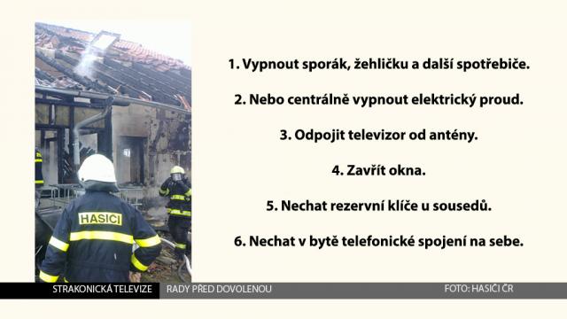 Léto je doba, kdy odjíždíme na dovolenou a na delší čas opouštíme své byty a domy. Připomeňme si, na co nás upozorňují hasiči. Za prvé - nezapomenout vypnout sporák, žehličku a další tepelné spotřebiče. Za druhé - centrálně vypnout elektrický proud, pokud máme vyprázdněnou ledničku a mrazák. Za třetí - odpojit televizor od antény. Za čtvrté - zavřít všechna okna. Za páté - nechat rezervní klíče u sousedů.Za šesté - v bytě, nebo u sousedů zanechat telefonické spojení na sebe.