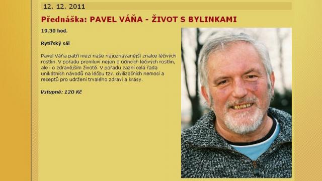 Mezi naše nejuznávanější znalce léčivých rostlin patří Pavel Váňa. Ten o účincích léčivých rostlin a zdravějším životě bude mluvit v pořadu, kde zazní celá řada unikátních návodů na léčbu tzv. civilizačních nemocí. Přednáška Pavla Váni se koná v pondělí 12. prosince v 19:30 v Rytířském sále strakonického hradu. (mav)