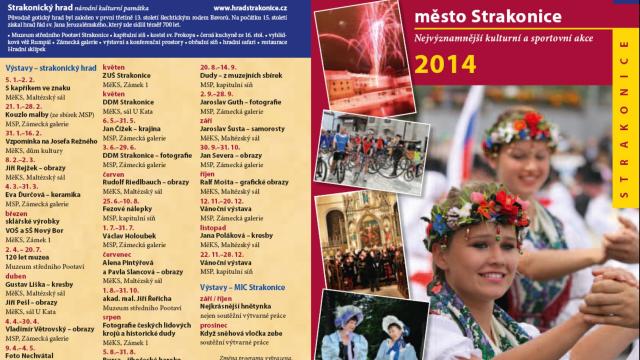 O nejdůležitějších společenských, kulturních a sportovních akcích, které se budou letos konat ve Strakonicích, informuje nový propagační leták. Ten je k dispozici zdarma v Městském informačním centru na Velkém náměstí. Z bohatého programu se obyvatelé i návštěvníci města se mohou těšit například na XXI. Mezinárodní dudácký festival, který se letos uskuteční 21. až 24. srpna. (bob)