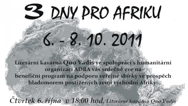 Literární kavárna Quo Vadis ve spolupráci s humanitární organizací ADRA pořádá ve dnech 6. - 8. října benefiční akci Tři dny pro Afriku. Výtěžek veřejné sbírky bude věnován hladomorem postiženým zemím východní Afriky. Program začíná ve čtvrtek 6. října v 18 hodin koncertem keltské hudby v podání studentské skupiny Ádh Mór. A například v pátek 7. října rovněž v 18 hodin bude v kavárně k vidění komponovaný pořad o Africe. (bob)