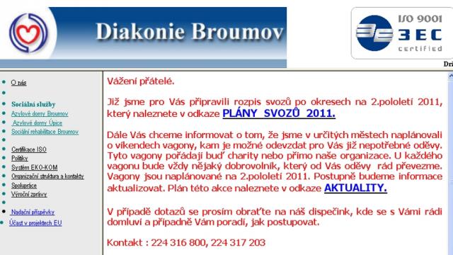 Diakonie Broumov děkuje všem dárcům a účastníkům humanitární sbírky, která se konala 28. listopadu ve Strakonicích. Výsledkem sbírky jsou dva vagony oblečení a 12 560 korun na dopravu. Příští sbírka se uskuteční pravděpodobně v květnu 2012. (bob)